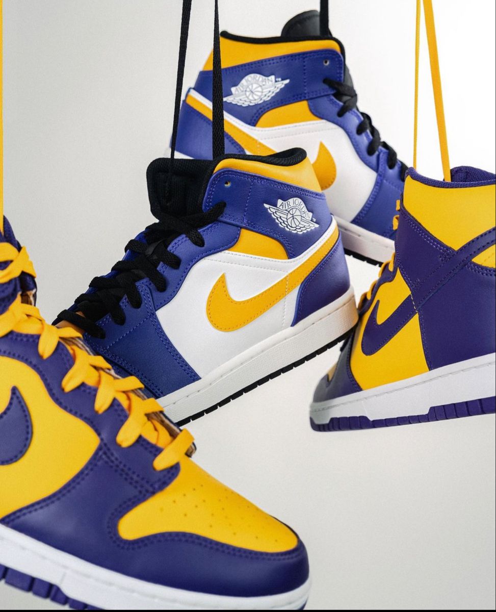 The G Air Jordan 1 Mid Lakers DQ8426-517 showcases iconic purple and gold team colors with premium leather construction, delivering accurate Lakers-inspired branding and classic AJ1 styling.