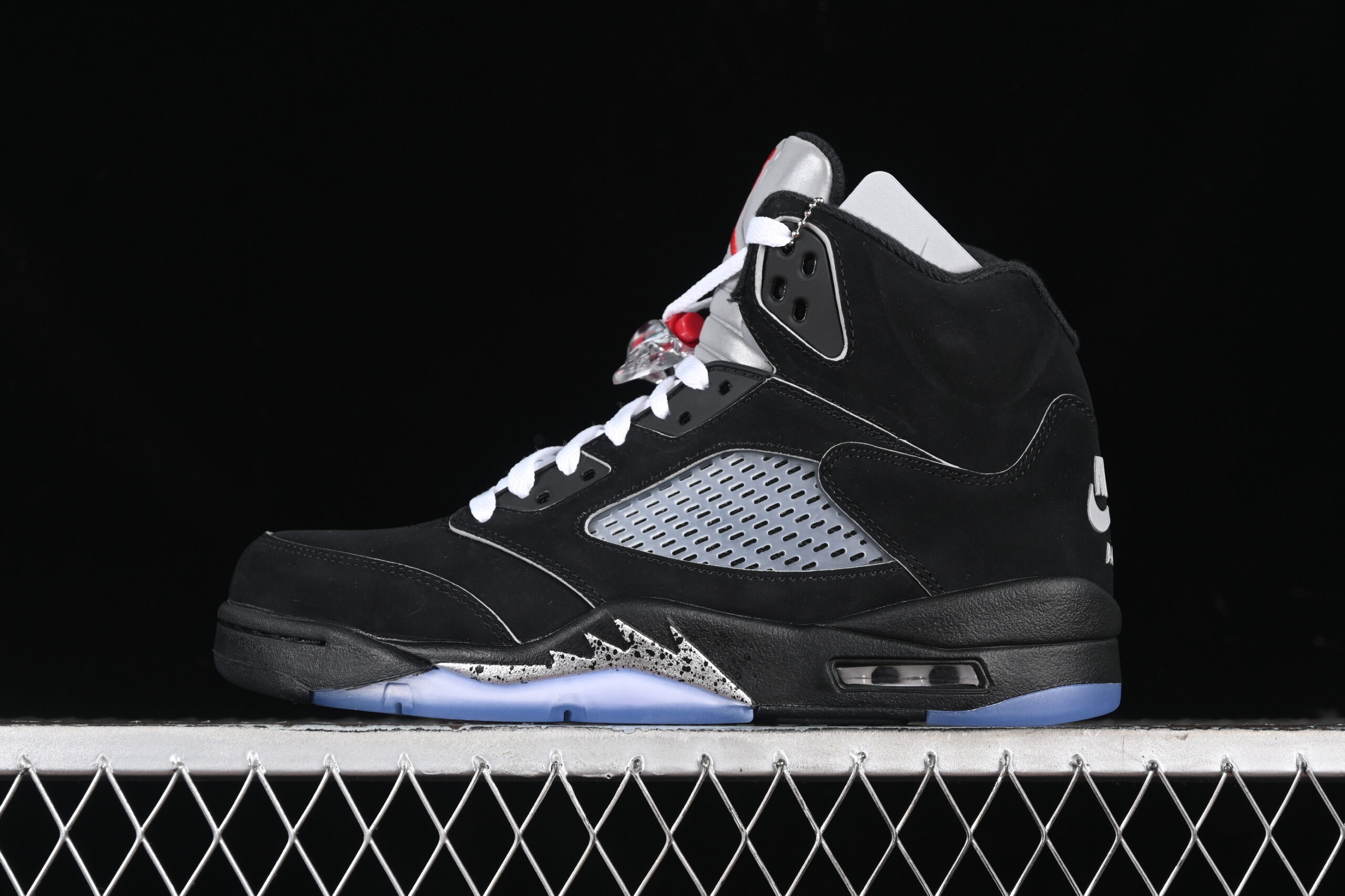 This model includes a black nubuck-style upper, metallic midsole accents, and a reflective tongue. The shark-tooth midsole pattern enhances the original AJ5 look, while translucent outsole elements reinforce traction and visual appeal. The structure and proportions remain true to the authentic AJ5 silhouette.